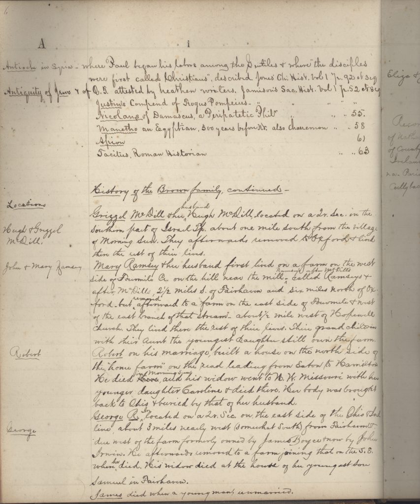 below: Unfinished page with sidebar heading. He clearly intended to continue his work on the Brown Family in the United States – his wife, Sarah Emily McMichael Brown, B.A., A.M. (1832-1922) was also an educator and did even more extensive genealogical research in her own McMichael and FitzRandolph ancestors. Materials from her research, passed on to other family members, were expanded by yearly family reunions held in Hartstown and Conneaut Lake, PA, and many were deposited in Western Reserve Historical Society in Cleveland. I have never seen any of the original records, nor tried to access them, other than a long genealogy going back prior to William the Conqueror which she left to my uncle James D. Brown and a one page paper on the McMichaels circulated at family reunions.