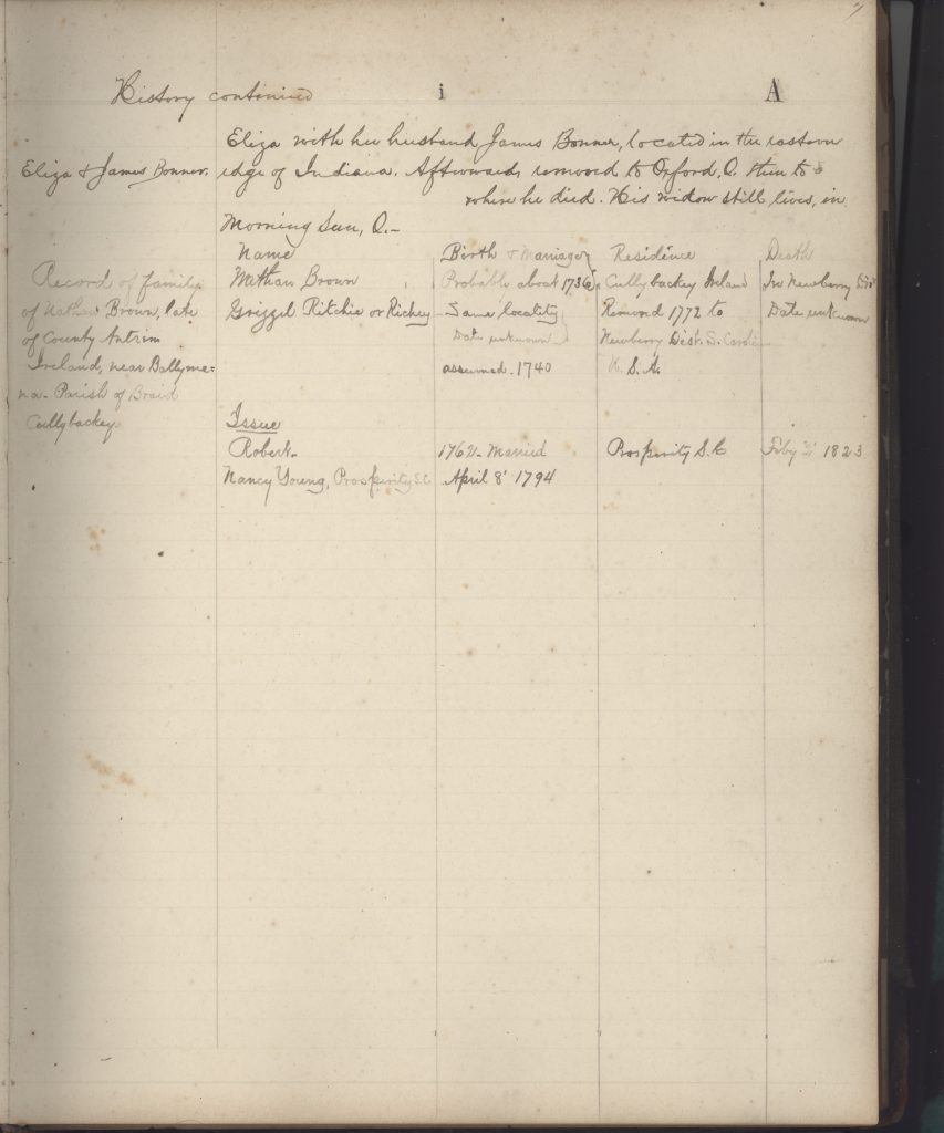 - In another branch of the family there is an even less accurate account of the same facts, written down in 1936 – published as an appendix to Marsha Hoffman Rising’s 2010 genealogy of Nathan Brown’s descendants – probably both manuscripts are repeating the oral history passed on by Elizabeth Beggs Brown